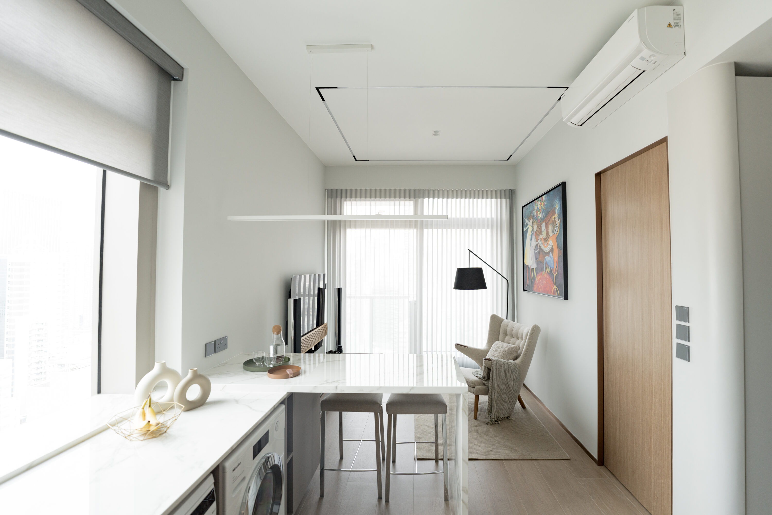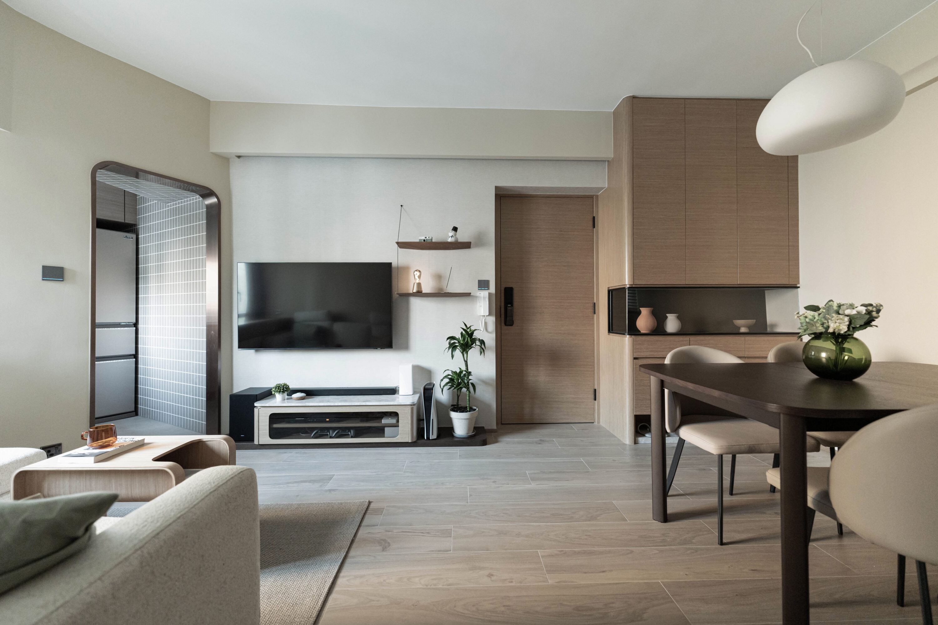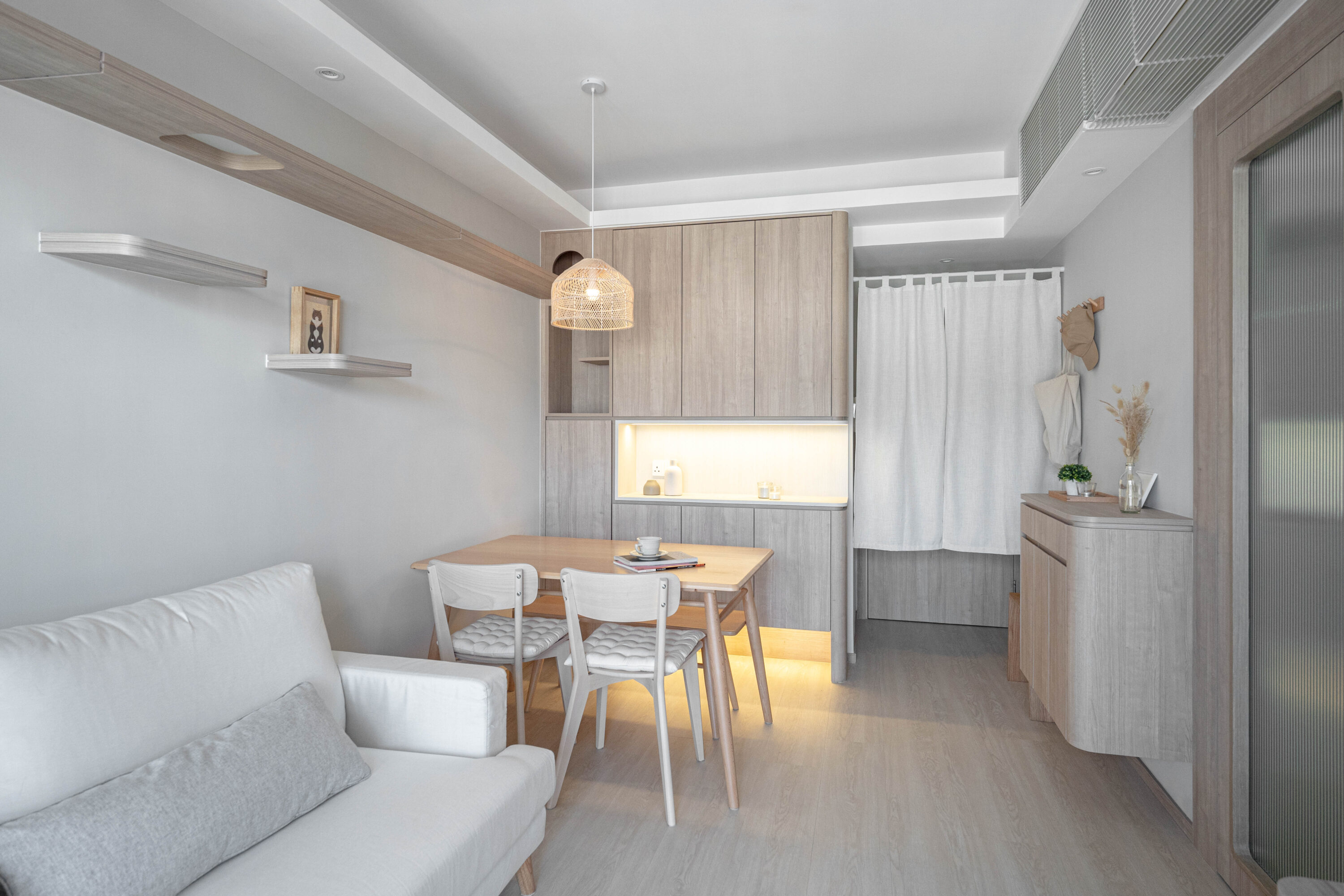 設計師把大部份的儲物高櫃以白色為主,而原木色作配搭,加入懸空、玻璃等設計,達致收納及展示空間齊存卻不壓迫。屬於設計師與客人共同創造的簡約風格,每一處地方、每一處選材都有著它背後的用意,以達致一步到位的設計。