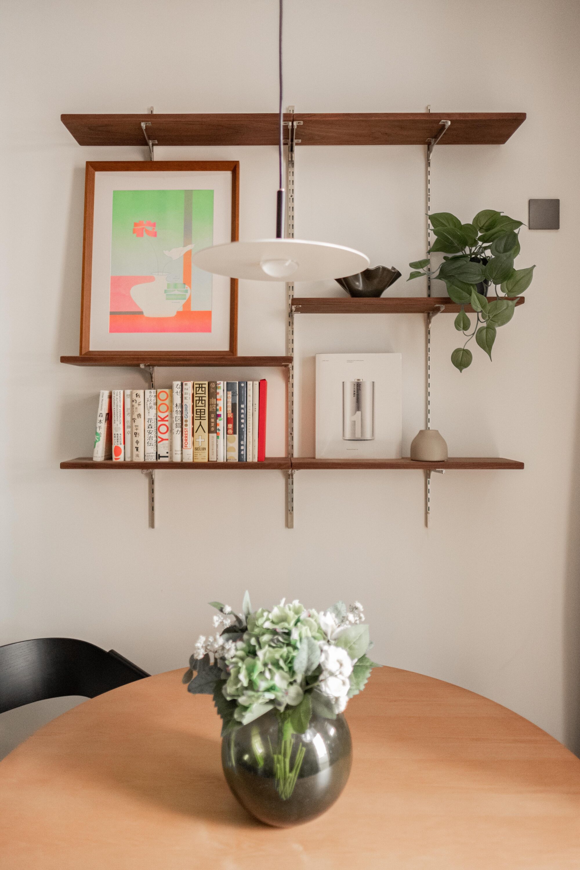 單位為一對年輕夫婦設計,是次設計著重空間感及自然光線,因此在空間規劃中,設計師盡量以裝飾性層板及半腰櫃作收納或展示,避免阻擋自然光。入門位置,弧形天花設計修飾不同的天花高度,全屋鋪以木紋石塑地板,與深色傢俱作對比,一抺陽光影照下,營造出溫暖舒適氛圍。廚房及浴室分別以白色及灰米色為主,特式磁磚拼湊,延續全屋簡約俐落、明亮的感覺。