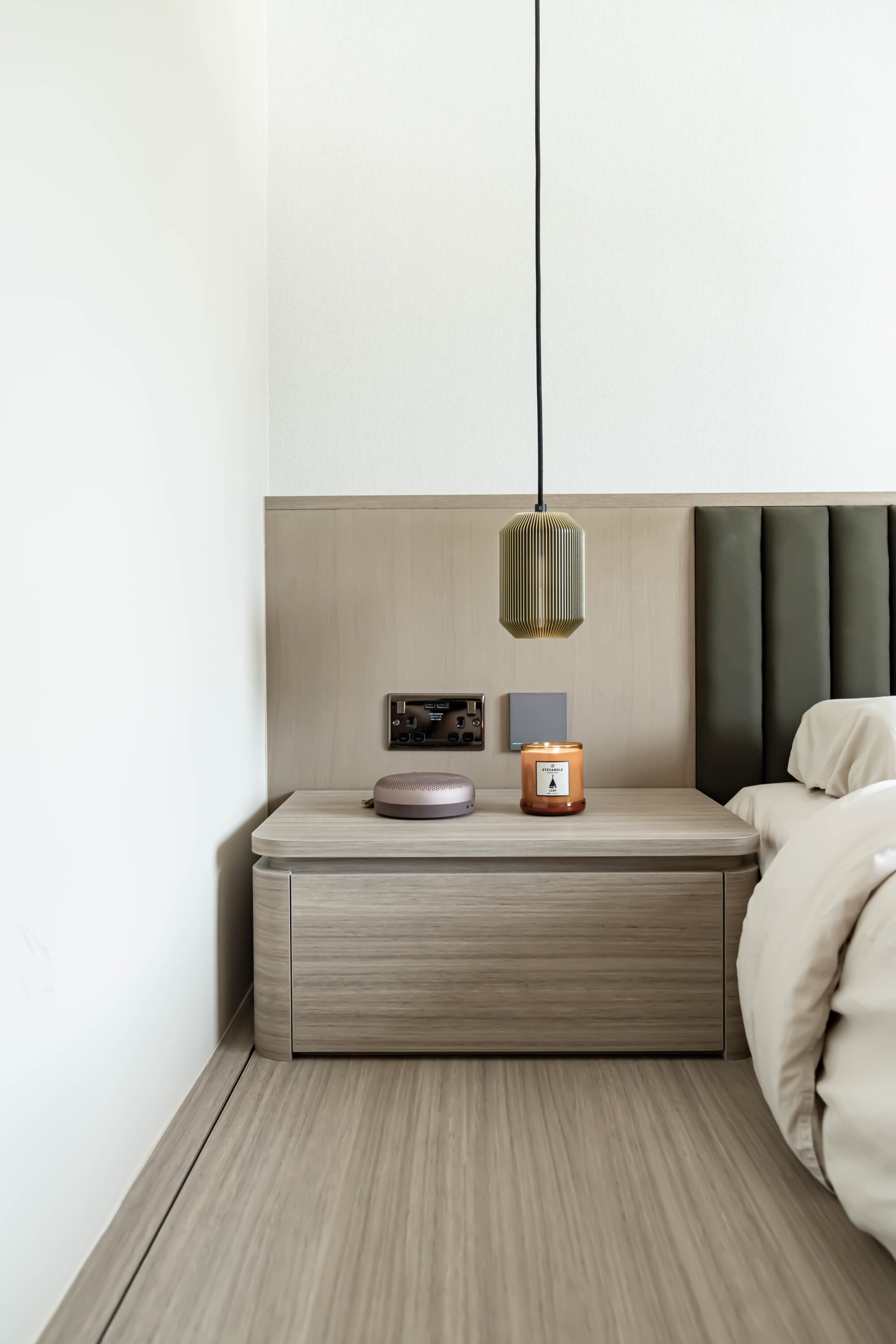 我們在全屋用上不同的物料,統一的色調塑造這具備品味的環境。以今年大熱色系奶茶色系(Beige Color)作主調,帶來寧靜而舒適之感,配上柔和效果的反燈槽,鋪陳出深層「禪」意。以實用性及空間感為大前題,設計師善用客廳和主人房的窗台位置,加設儲物櫃與飾物櫃,主人房也設計了儲物地台,走廊亦有儲物天花,大大提升儲物空間,卻不影響最必要的空間感!
