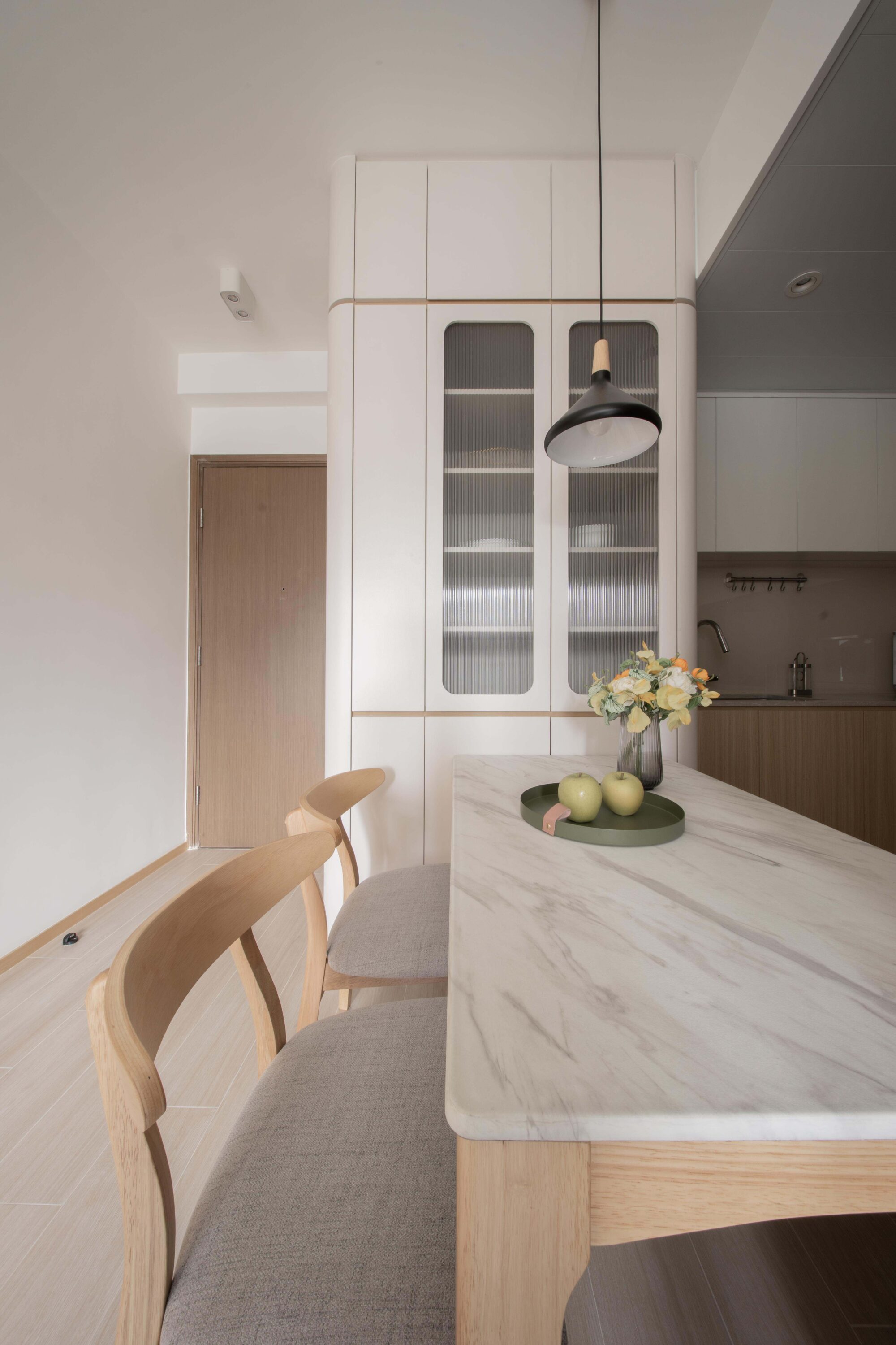 重新把空間整合後,與玄關鞋櫃連貫的餐邊櫃可放置大量餐具,進一步增加開放式廚房的收納。在客廳我們於電視特色牆加入條子設計,加強空間的層次感和質感,亦特地加設玻璃高櫃,用作展示戶主的收藏品。 設計中多運用弧形飾面櫃弱化通道的角落,讓視覺效果更加連貫舒適。